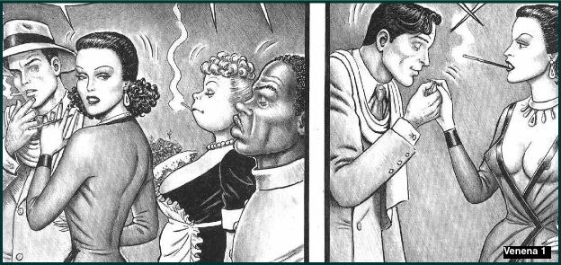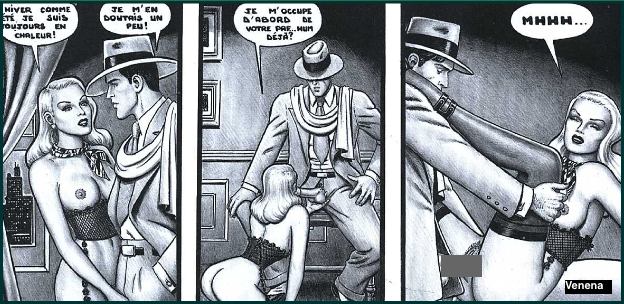 Censorship report: The album "Fiona" has been censored in several publications. The reason is a sodomistic encounter with a dog. The actual "act" is not visible. Some of the pre-releases in magazines were shortened by cutting single pictures, sometimes even whole pages. The German album edition of "Fiona" (Comic Trading/Loempia, Magic Strip) has been simplified by two pages. In order to make some sense of the scene, two new pictures were drawn for page 16, which are not to be found in the French original edition. |