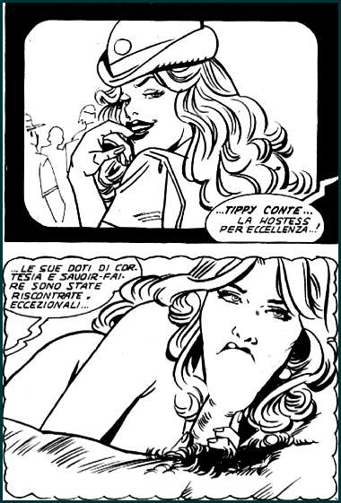 In Florida angekommen, wird sie sofort Opfer einiger "Schurken", die ihr an die Wäsche wollen. Tippy kann die Ganoven abwehren und trifft auf die anderen Hauptdarsteller, die gerade im nahe gelegenen See baden. Das Trio schließt sich zusammen, um gemeinsam die Ausbildung zu den "Gli angeli Volanti", den "drei fliegenden Engeln“, zu absolvieren. Zuerst wird Tippy von den anderen Damen sexy gestylt. Haare und Kleidung werden gewechselt und aus dem schüchternen Mädchen aus der Provinz wird - nach nur wenigen Seiten - die blonde, sexy Stewardess in spe. In der Flugschule angekommen, beginnt das gemeinsame Training. Natürlich gibt es die obligatorischen lesbischen "Begegnungen" in der Gemeinschaftsunterkunft. In der Schule treffen die Damen aber auch auf attraktive Ausbilder wie den charismatischen Philippe Boyle. Am Ende der turbulenten Episode droht der offenherzigen Tippy sogar der Rauswurf aus der Schule - doch der moralische Fehltritt (eine Verwechslung) kann aufgeklärt werden und Tippy bekommt doch noch ihre Chance, die Schule abzuschließen. Die ursprüngliche Idee von Renzo Barbieri war es wohl, aus "Hostess" eine Art erotische Drei Engel für Charlie ("Charlie's Angels") zu machen. Deshalb auch der Titel von Ausgabe 2 "Gli angeli volanti". Tatsächlich hat die Serie von Anfang an neben der erotischen Komponente auch eine vage Thriller-, Spannungs- oder Action-Komponente, die im Laufe der Folgen immer lebendiger wird. Nach den ersten Episoden gewann die Figur der schönen Tippy immer mehr an Tiefe und blieb am Ende als einzige Protagonistin übrig. Dass die Heldin Tippy Conte in einigen Handlungen mit körperlicher Gewalt und "ungewolltem Geschlechtsverkehr" konfrontiert wird, ist wohl dem (Fumetti-)Genre geschuldet. Am Ende der Serie wird der blonden Tippy Nymphomanie nachgesagt, die sie sogar in Schwierigkeiten mit ihren Arbeitgebern bringt. Was beim Durchblättern der Ausgaben auffällt, ist, dass immer wieder einige Szenen/Bilder fast etwas dreist wiederverwendet (kopiert) wurden. Wie zum Beispiel der sommersprossige Junge, der in mehreren Ausgaben in gleicher Weise eine Tüte Bonbons geschenkt bekommt (siehe Bildbeispiele unten). Zu diesem Einzelbild gibt es sogar Varianten, wie zum Beispiel ein Mädchen im Rettungsboot. Auch einige Sexszenen wurden recycelt und nur in einigen Nuancen verändert. "Hostess" ist wie fast alle Fumetti-Serien ein Kind seiner Zeit. Mit all ihren Klischees, Witzen und unverhohlen sexistischen Ansichten. Die Stewardess als Sexobjekt ist längst von KI, 3D, Pornhub und Onlyfans abgelöst worden. In den 1970er und 1980er Jahren waren Flugbegleiterinnen und Piloten durchaus Objekt zahlreicher Begierden und boten Stoff für schmutzige Romane, erotische Sexfilme und frivole TV-Serien. "Hostess" glänzt mit ausgiebigen Sexszenen, abwechslungsreichen Actionsequenzen und einer eher handlungsarmen Handlung. Grafisch ist die Fumetti-Produktion leider eher durchschnittlich und der Wechsel der Zeichner ist für den Leser deutlich sichtbar. So sind die Ausgaben von Pierluigi Cerveglieri in einem sehr skizzenhaften, flüchtigen - semi-funny - Stil gehalten, der sich deutlich vom Stil des Hauptzeichners Gianni Pinaglia unterscheidet. Die Arbeitsbelastung Pinaglias ist auch daran zu erkennen, dass sein skizzenhafter, aber realistischer Strich leider Qualitätsschwankungen aufweist. Dies ist jedoch bei vielen Fumetti-Produktionen dieser Zeit zu beobachten. Viele Seiten mussten in einem engen Produktionsplan bewältigt werden. Für Feinheiten blieb oft keine oder nur wenig Zeit".(5)