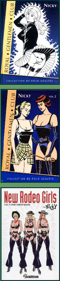 Nicky 1986 erschienen erste Arbeiten des französischen Künstlers unter seinem richtigen Namen (Name der Redaktion bekannt) im Magazin "À Suivre" (das Magazin erschien 1978 bis 1997 bei Casterman). 1998 entdeckten aufmerksame Leser seine Handschrift im erotischen Monatsmagazin "Geisha". Unter dem Pseudonym "Nicky" präsentierte der Künstler seine bislang beste erotische Comic-Arbeit: den Royal Gentlemen Club und Rocking Girls. Der "Royal Gentlemen Club" ist eine wundersame Sammlung von expliziten Kurzgeschichten, die von einen exklusiven englischen Herrenclub erzählen. Natürlich sind auch wunderschöne Frauen in die "Club-Aktivitäten" involviert, deren Vorname alle mit "y" enden. In der Folge also Cathy, Jenny, Betty (Smith), Wendy, Kelly, Dolly (aus Band 1) und Nancy, Sandy, Fanny, Candy, Holly, Bunny (aus Band 2). Die Figur des Butlers, ein gewitzter alter Mann mit Glatze, taucht auch im acht Kurzgeschichten umfassenden Sammelband "Rocking Girls" auf. Dort heißen die Kapitel, ähnlich wie in "Gentlemen Club": Peggy, Polly, Kitty, Cindy, Debby, Becky, Maggy und Milky. Hohe Erzählkunst darf man nicht erwarten; doch die Comic-Geschichten bieten mit ihrem anziehenden und nostalgischen Charme ein anregendes und kurzweiliges Lesevergnügen. Der Zeichenstil von Nicky, der sehr an Arbeiten von Anton Drek oder Baldazzini erinnert, fängt die Themen um Erziehungsspiele, Fetisch, S&M, Rollenspiele, Oldie Sex, Cosplay, ... hervorragend ein. Comicalben von Nicky können durchaus noch bestellt werden und sind unter anderem bei amazon.fr zu finden. Englische Übersetzungen sind jedoch nur als "Fan-Scans" zu haben. Der Vollständigkeit halber sollten die New Rodeo Girls nicht unerwähnt bleiben. Nicky versucht sich dabei in einem Manga-ähnlichen Zeichenstil, der jedoch etwas daneben ging. Eine Neuauflage der Geschichten erschien im Jahr 2015 beim französischen Label Dynamite. Es bleibt abzuwarten, ob sich Nicky mit neuen Comicgeschichten zurückmeldet. Veröffentlichungen/Publications (Auswahl/Selection): Quelle/Source: |